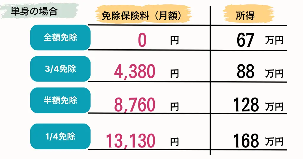 下記表は4つのコースの保険料の免除金額(月額)です。前年の所得になるため、一定の収入があると免除はできません。